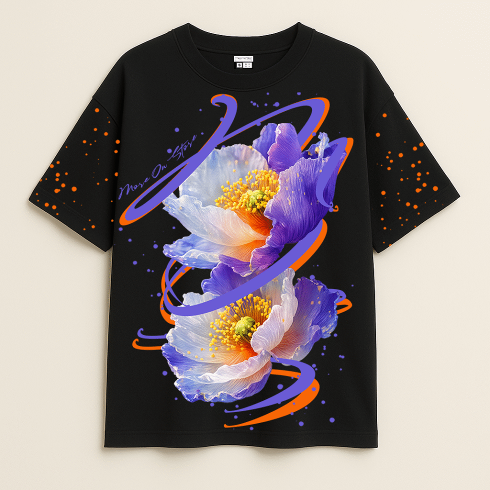 Elevate your streetwear rotation with a fusion of botanical beauty and high-voltage energy. This oversized black t-shirt features a hyper-realistic Dual Poppy design, rendered in vivid shades of electric purple, soft lavender, and sun-bright orange.