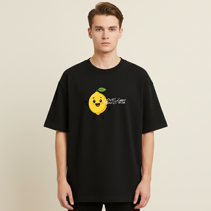 Below the character, the shirt features the text “LOVE Lemon Vitamin C Rich,” reinforcing the healthy, fresh, and citrus theme. The entire design is printed on a comfortable oversized black cotton tee (or specify the material/fit if you know it), making it perfect for an effortlessly cool, relaxed look.