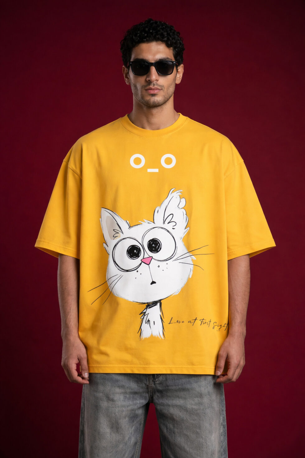 Make a bold statement with our “Love at First Sight” Oversized Yellow Graphic T-Shirt. Featuring a quirky, wide-eyed hand-drawn cat illustration, this tee blends high-street fashion with a playful edge. Whether you’re a feline enthusiast or a streetwear aficionado, this mustard-hued baggy tee is designed to turn heads.