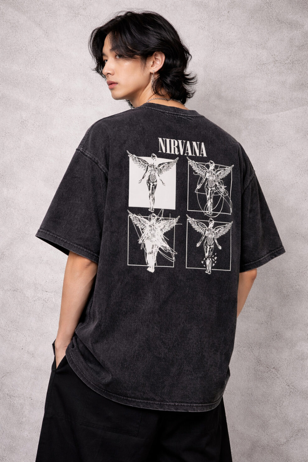 Elevate your streetwear rotation with our Vintage Washed Oversized Graphic Tee. Crafted for those who prioritize both silhouette and substance, this t-shirt features a meticulously achieved acid wash finish that gives it an authentic, lived-in charcoal grey tone. The front is anchored by a high-contrast white “In Utero” inspired angel graphic, while the back showcases a bold four-panel deconstructed art layout topped with “NIRVANA” typography in a clean serif font.